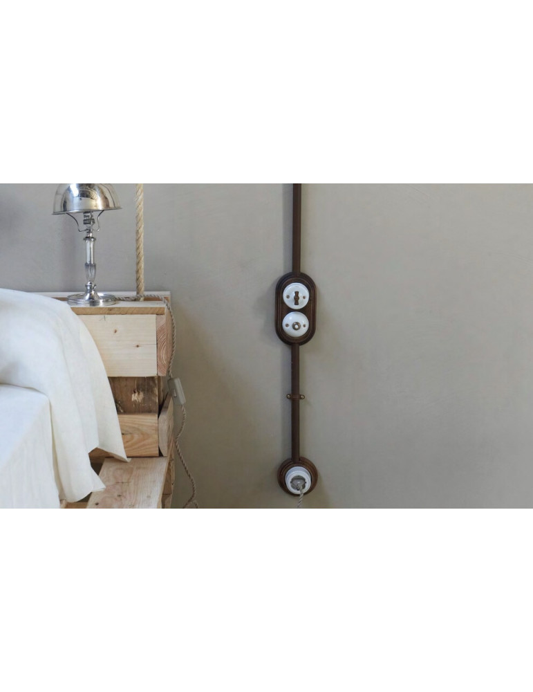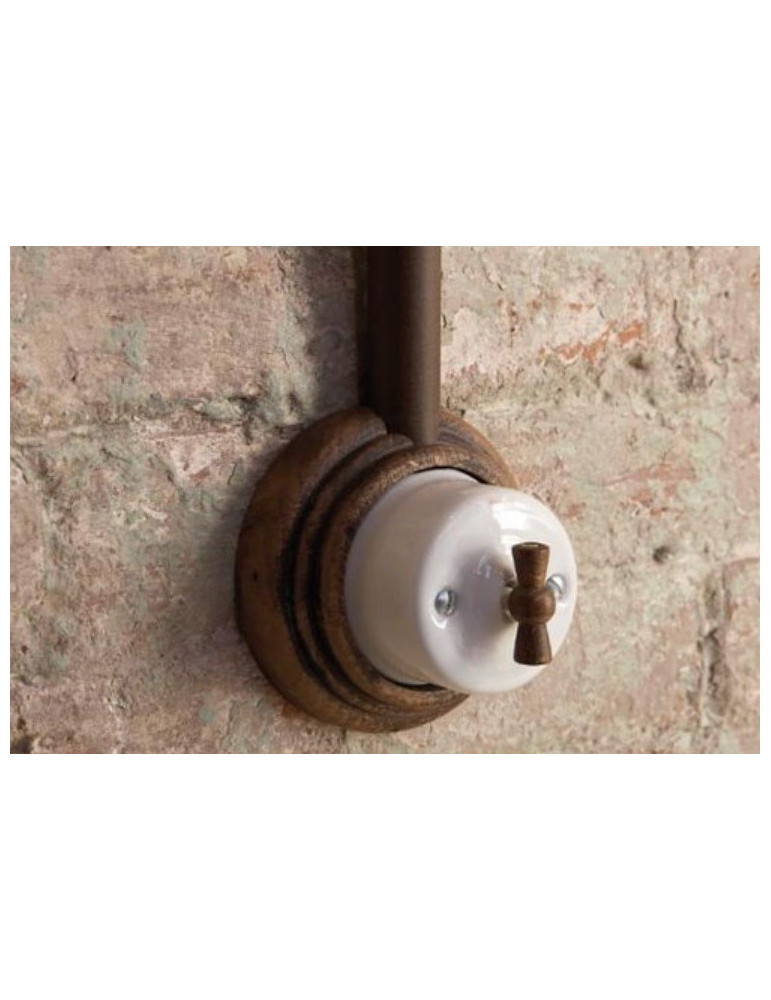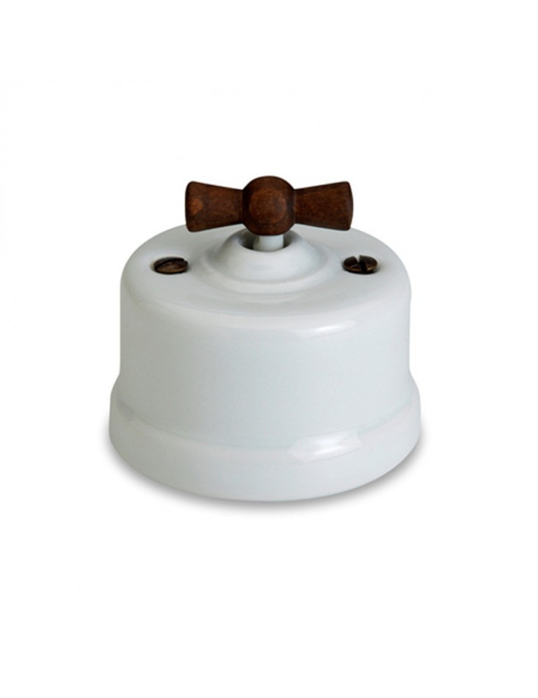 El auténtico interruptor, Fontini Garby, realizado en porcelana blanca. Robusto en su acabado y apariencia, con lazo rotativo de metales nobles y maderas naturales. Indicado para decoraciones vintage recreando el encanto de otros tiempos.