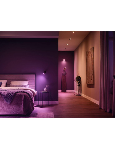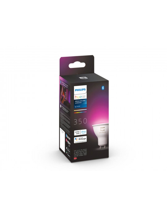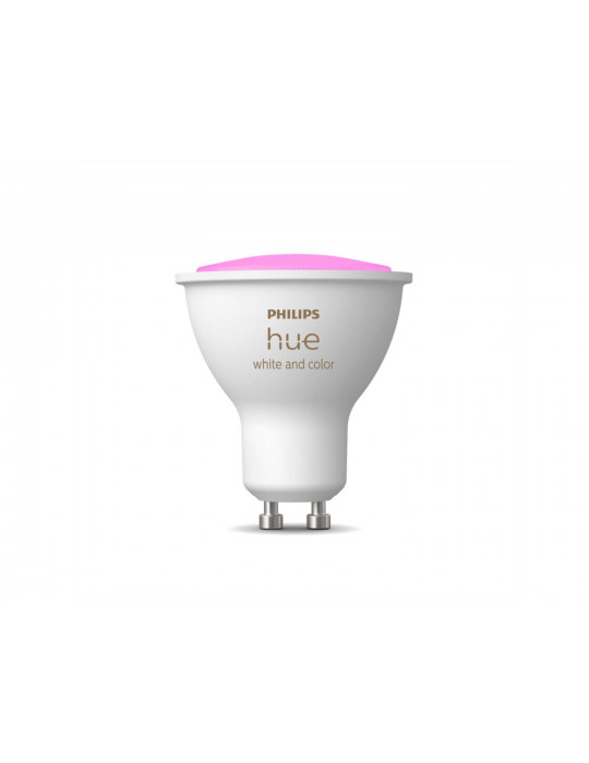 Bombilla Hue GU10 RGB regulable colores, disfrutaremos de una iluminación inteligente en cualquier lámpara, consiguiendo diferentes ambientes por sus 16 millones de colores, incluyendo todos los tonos de blanco. Se puede encender y apagar a través de bluetooth o con el puente Bridge hasta 50 bombillas.