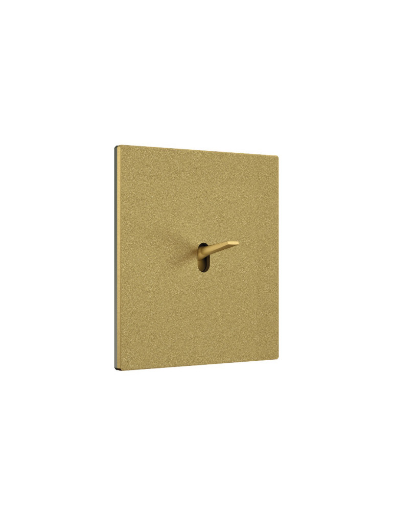Interruptor Font 5.1 tonalidad latón dorado sablé manecilla oro mate. La innovadora tecla que parece flotar sobre la placa es el elemento distintivo de esta colección con líneas escultóricas y un tacto de sus materiales nobles. Una joya de pared.
