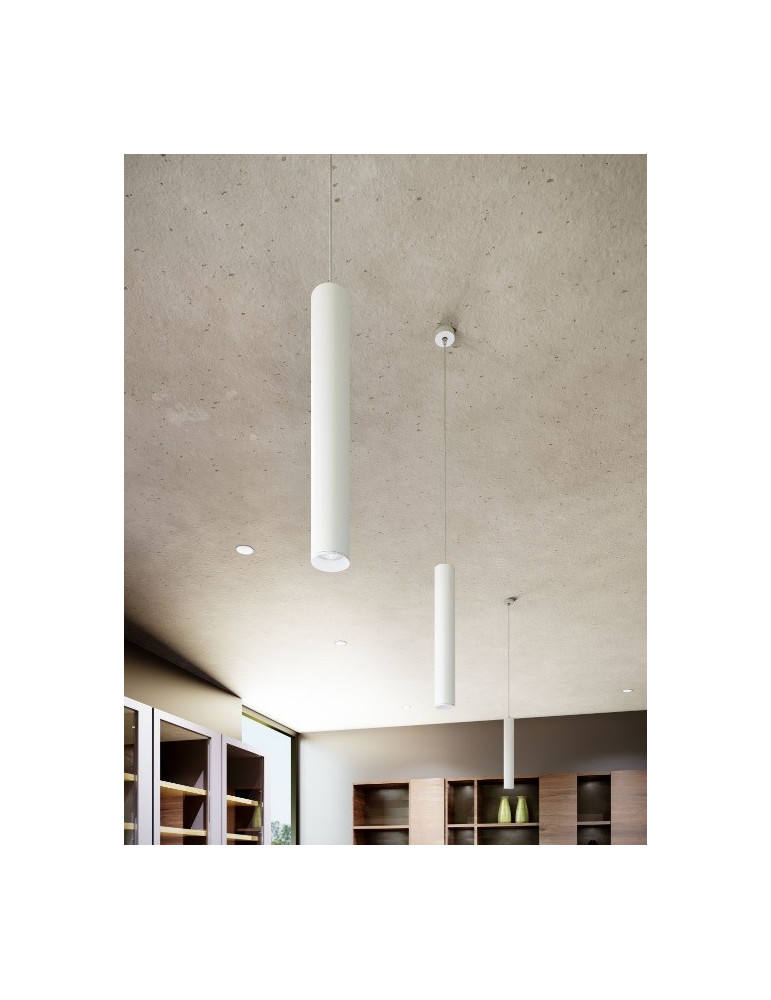 ATMOS es un foco Led decorativo en suspensión para interiores para bombilla GU10. Extrusionado en aluminio con florón de empotrar y de superficie.