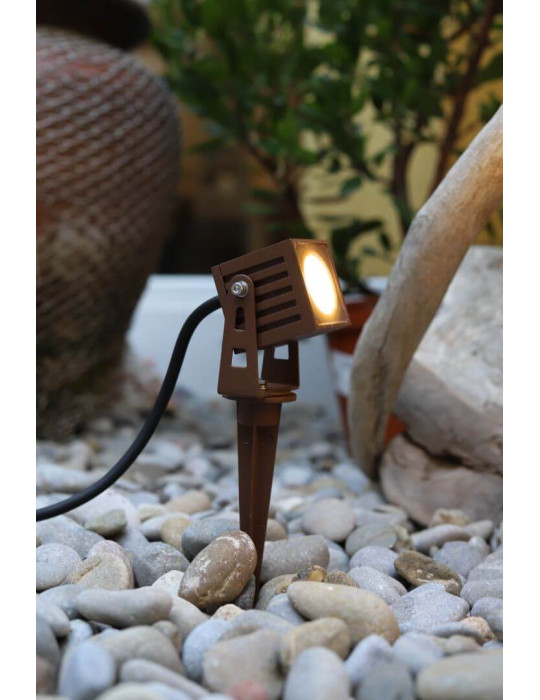 Zas square es un foco proyector led de 7W cuadrado para exterior, con una piqueta integrada para incrustar en césped o tierra, de fácil instalación y adaptabilidad por su rotación de 180º. Acabado en blanco,negro y corten.