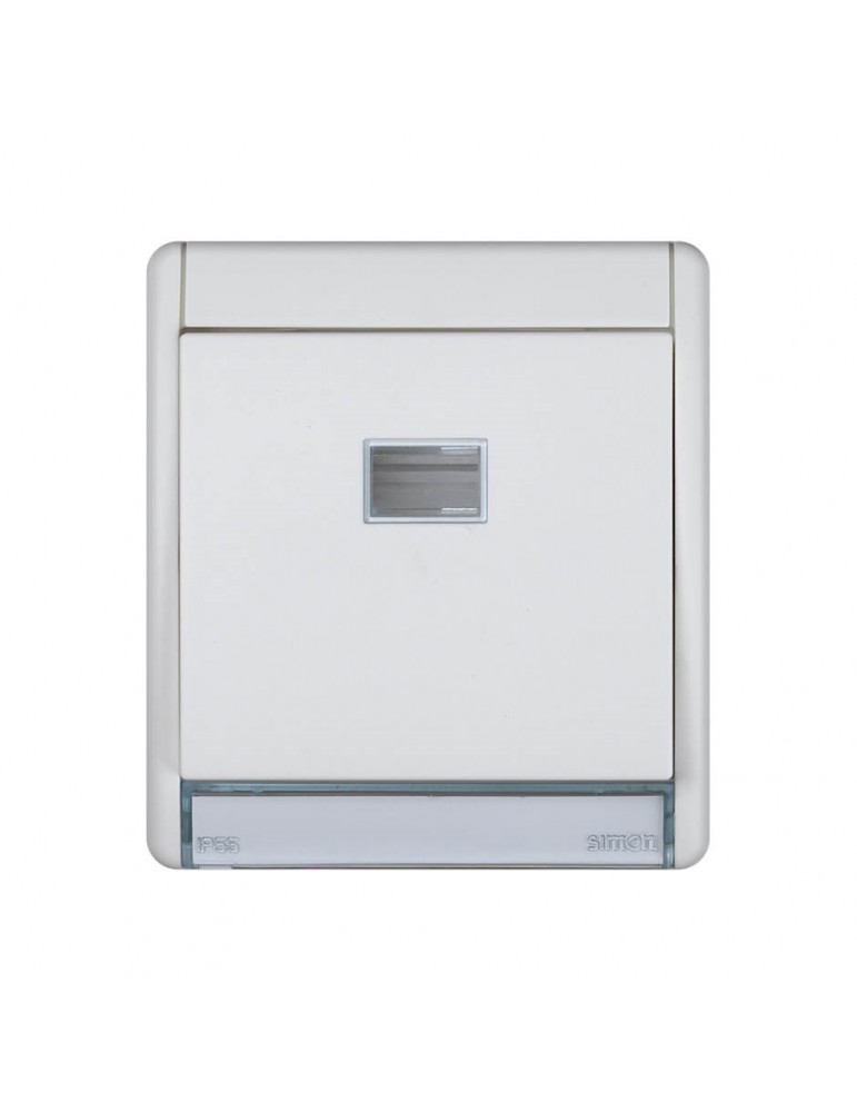 Simón 44 Aqua. Conmutador Monobloc 10 AX 250V con un nivel estanqueidad IP55, está disponible en dos formatos: el de empotrar con marco y un grado de dureza IK08 y y el de superficie con un grado de dureza IK07. Disponibles en color blanco.