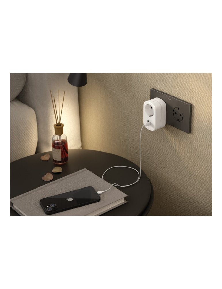 Adaptador con 1 toma de 16A + 1 puerto USB-A + 1 USB-C de carga rápida.