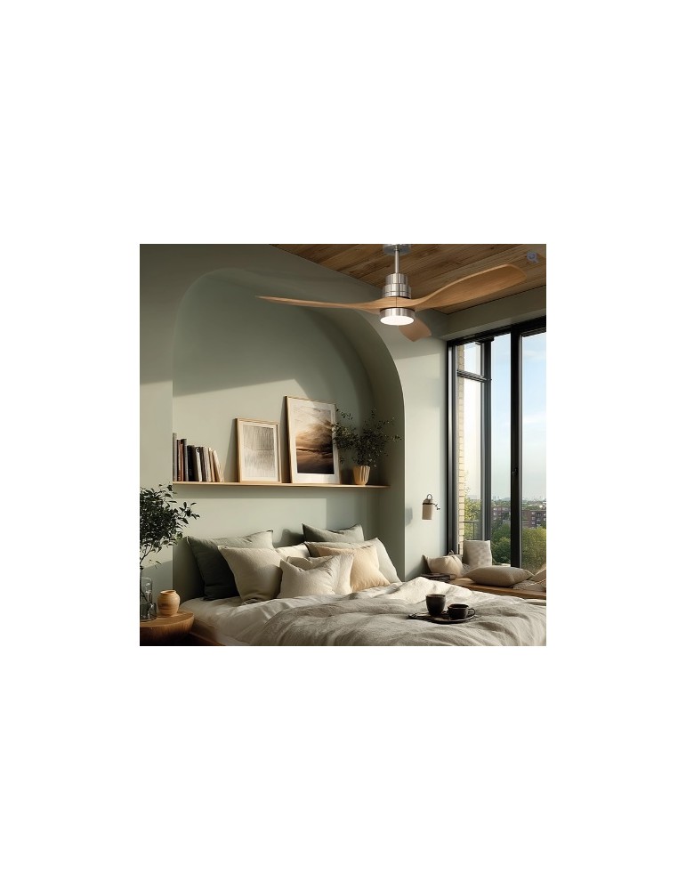 Ventilador de techo con luz LED Nalón, de 3 aspas fijas y 132 cm. de diámetro que incorpora un motor DC ultra silencioso de 35 w. y 6 velocidades, Tiene función de invierno y verano. Programable entre 1 h. y 8 h.. Con luz LED integrada de 24 w. y 2.400 lm.. Ideal para estancias grandes (< 25 m2). Con cuerpo en acero y plástico ABS. Difusor acrílico. Con mando a distancia, pilas no incluidas.