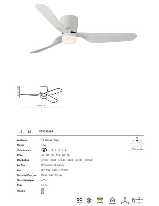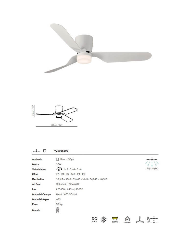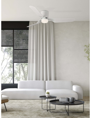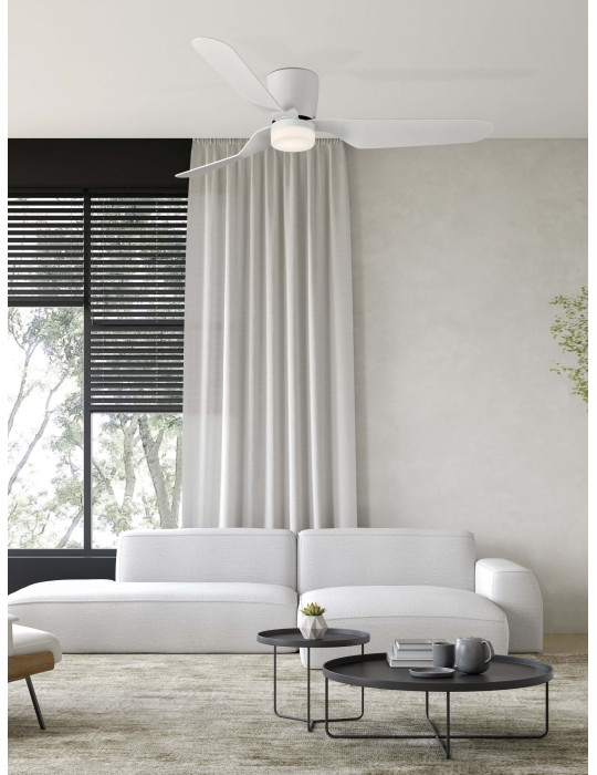 Ventilador de techo blanco, modelo DC con 3 aspas, luz de led integrado de 15W con mando a distancia para 6 velocidades y temporizador. Función invierno/verano.