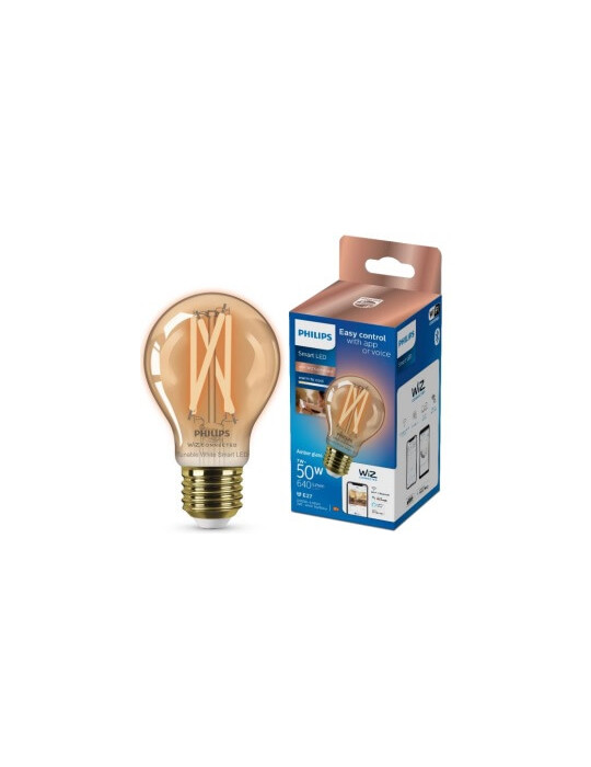 Esta bombilla Smart Led A60 con filamento ambar nos permite regular todas las tonalidades de blancos fríos a cálidos, dando un estilo vintage en las luminarias y focos empotrados estándar de tu hogar. Úsala con tu wifi para controlarla con la aplicación Wiz o con tu propia voz.
